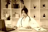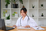 Woman doctor sitting alone in her clinic and writing notes. Female doctor writing in her notebook in office at the hospital