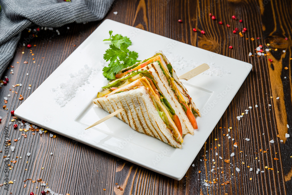 club sandwich with chicken on wooden table