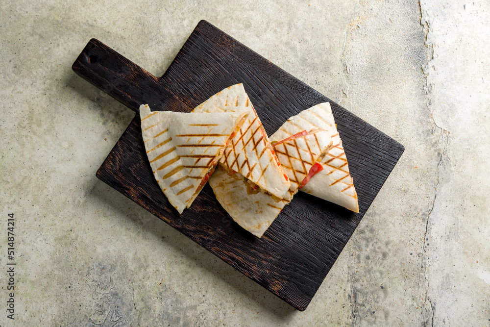 Mexican Quesadilla with chicken on dark wooden board on stone table top view
