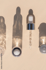 close up of pipette with pouring liquid serum with bottles and graphic shadows