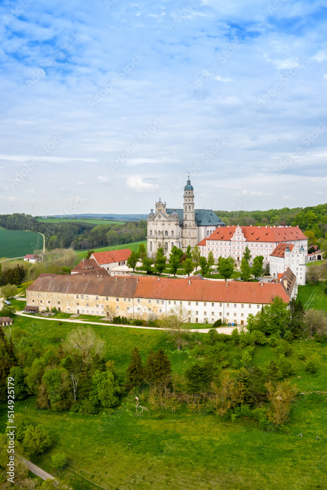 Neresheim monastery baroque abbey church aerial view portrait format in Germany