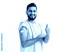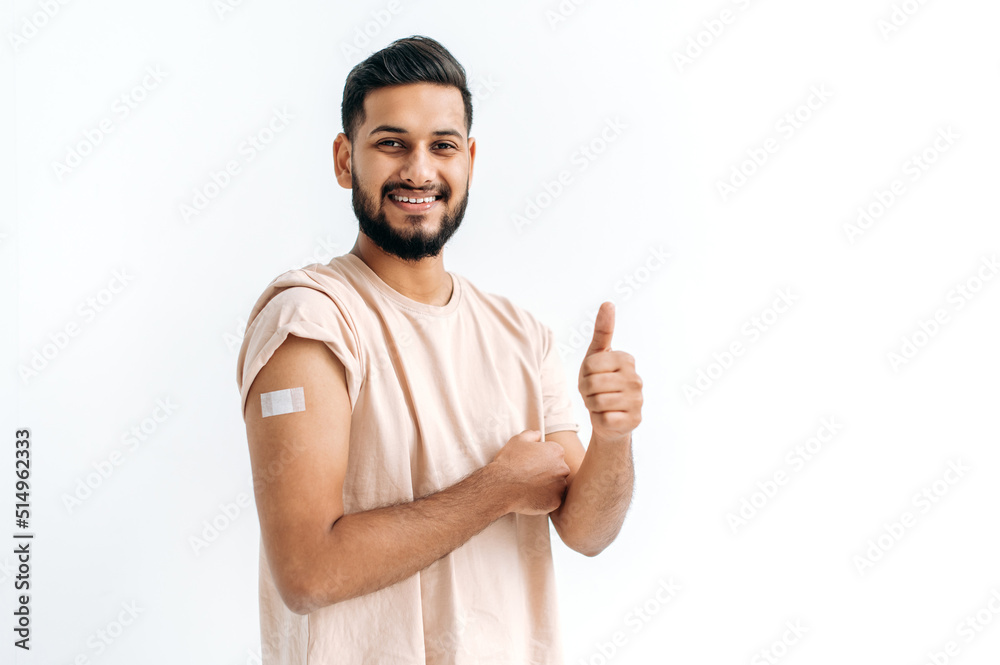 Vaccination and prevention concept. Positive indian or arabian guy, showing bandage plaster on arm after getting vaccination, immunization for viruses, stand on isolated white background, smiles