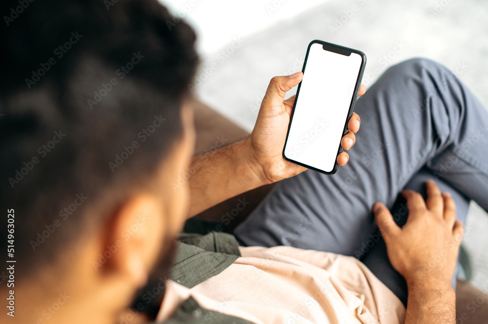 Gadgets and technologies concept. Modern smartphone with a blank white mockup screen for presentations, advertising, your text, in male hands. Top view