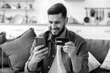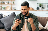 Online shopping, payment. Satisfied Indian or Arabic attractive guy, sit on the sofa in the living room, using a bank card and a smartphone, making online purchases, making payments, ordering delivery