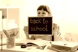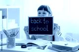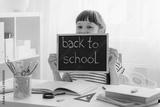 Happy smiling schoolchild holding small blackboard with text back to school