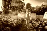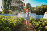 Child watering plants in garden. Kid with water hose in sunny backyard. Little girl gardening. Summer outdoor activities during the summer holidays in the village.