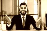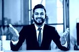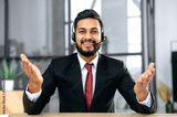 Attractive young indian or arabian businessman, financial advisor, sit at desk in modern office, having video call conversation with client, male economic expert records online training course, smile