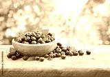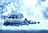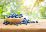 Fresh blueberries in bowl on wooden table over summer background