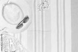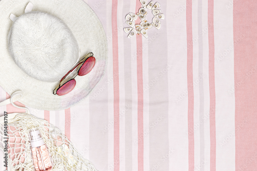 Summer flat lay with sun hat, sunglasses, cosmetics products on striped beach towel as background. Summer holiday, vacation, rest concept. Top view summertime accessories, white pink pastel color fon.