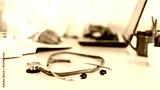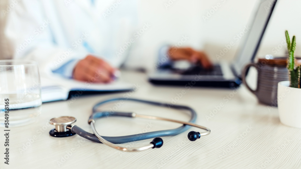 Female doctor hands typing on laptop computer keyboard, search medical information with laptop and medical stethoscope on the desk at office.