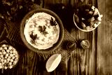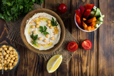 Top view of hummus in the bowl and vegetable on the rustic wooden background. Closeup.