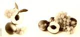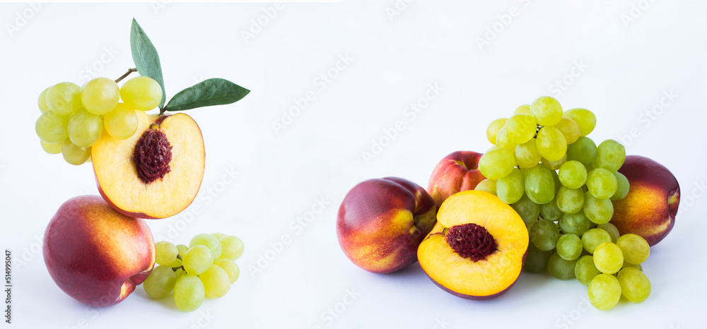 Banner. Closeup on nectarine and green grape on the white background. Copy space.