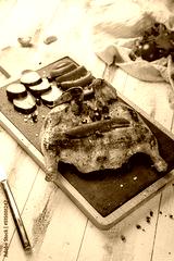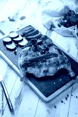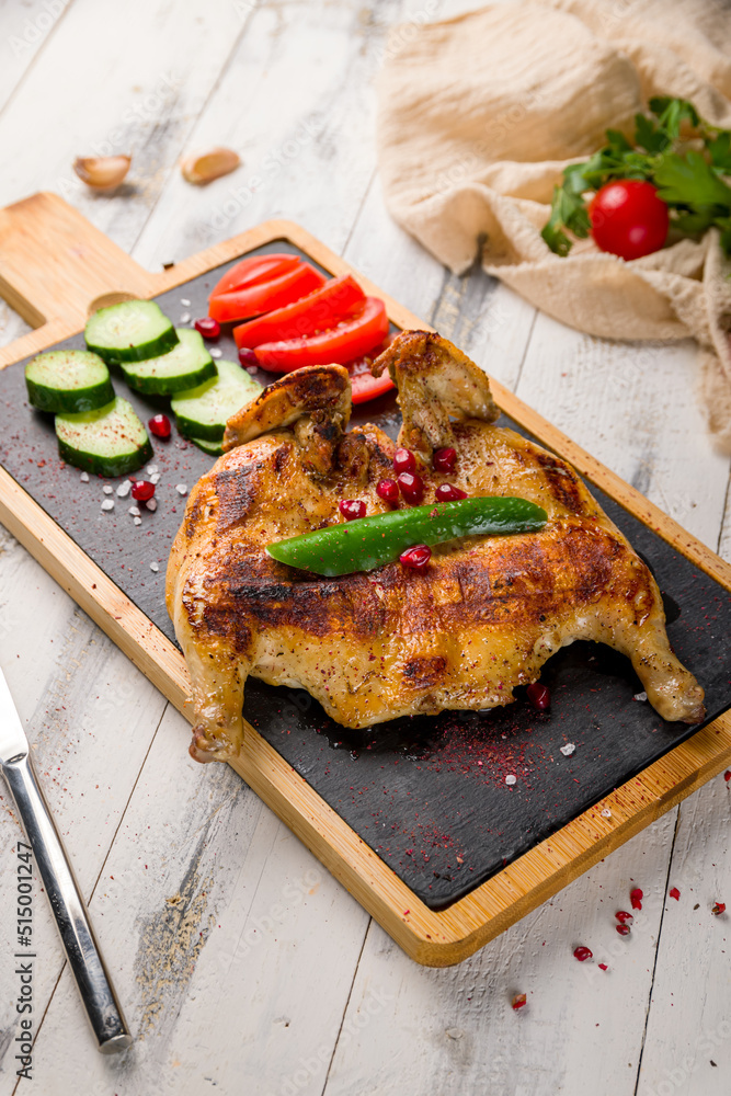 fried chicken tobacco on black stone plate on white wooden table