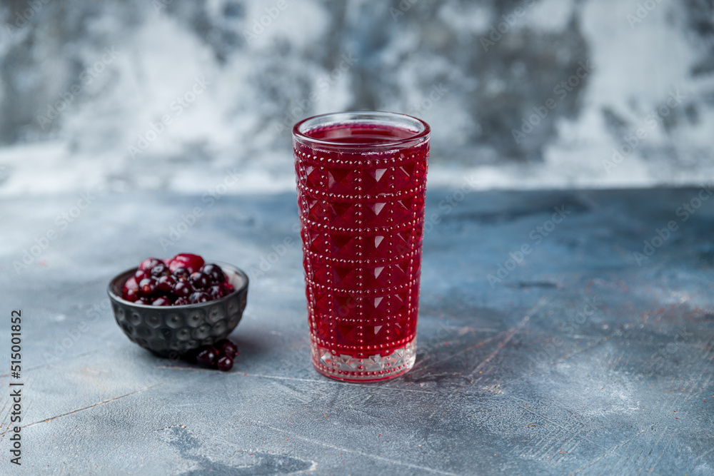 a glass of red compote on grey table