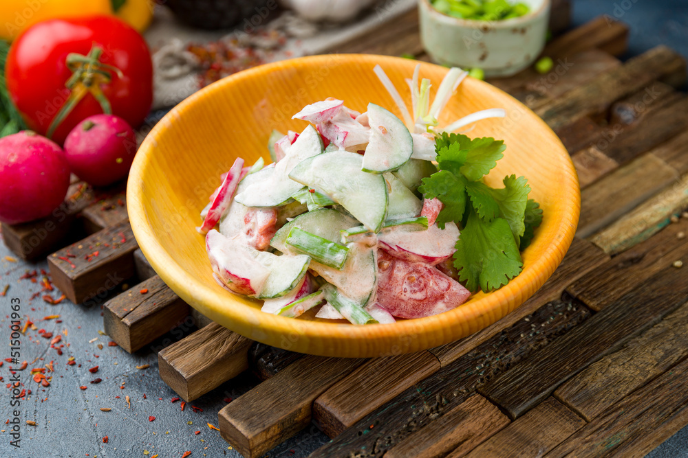 Vegetable salad with tomatoes and cucumbers with sour cream on grey table