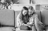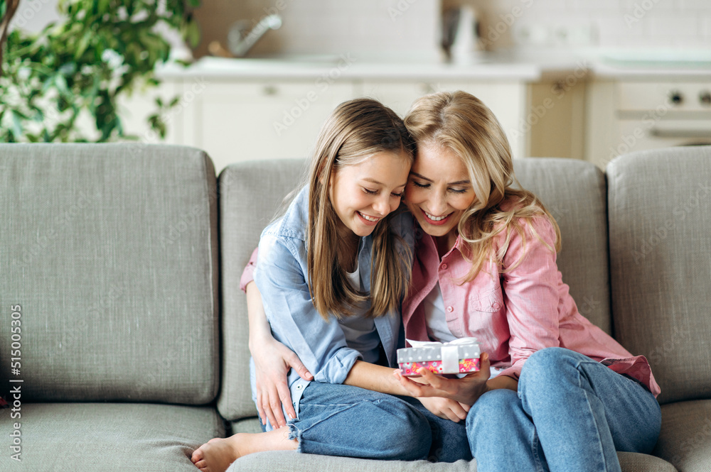 Happy mother and daughter, sitting together at home on the sofa in the living room, hugging, holding a small box with a gift in their hands, looking forward to seeing what's inside, smiling, rejoicing