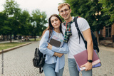 Beautiful happy couple summer portrait. Young joyful smiling woman and man in a city. Love, travel, tourism, students concept