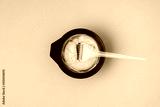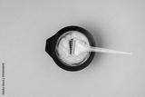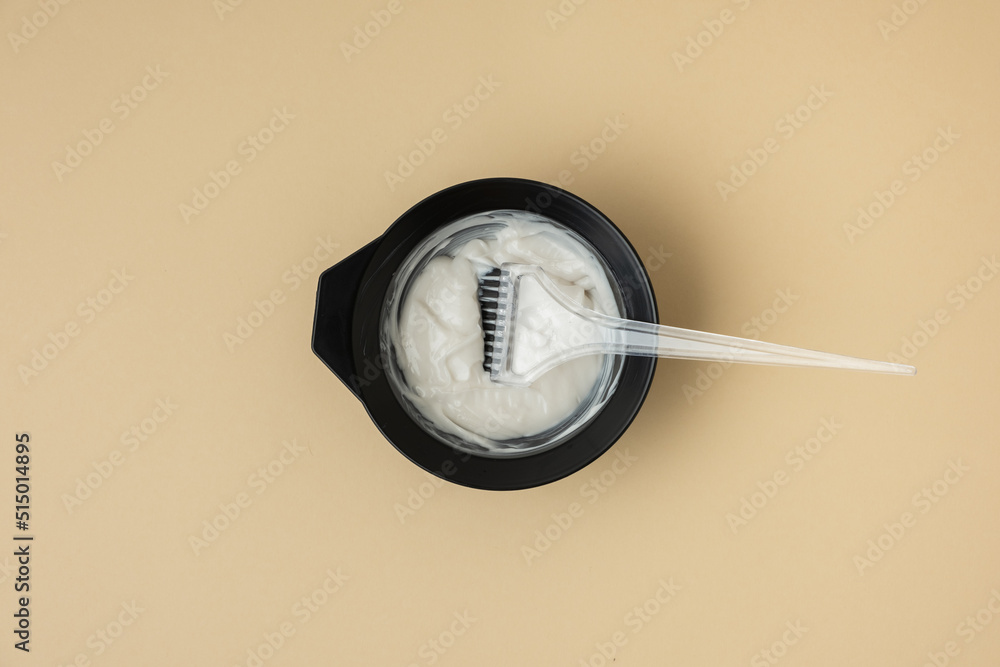 Flat lay of hairdresser equipment for mixing hair dye. Professional black jar with a brush on beige background. Preparing dye for hair coloring. Free space for text