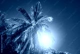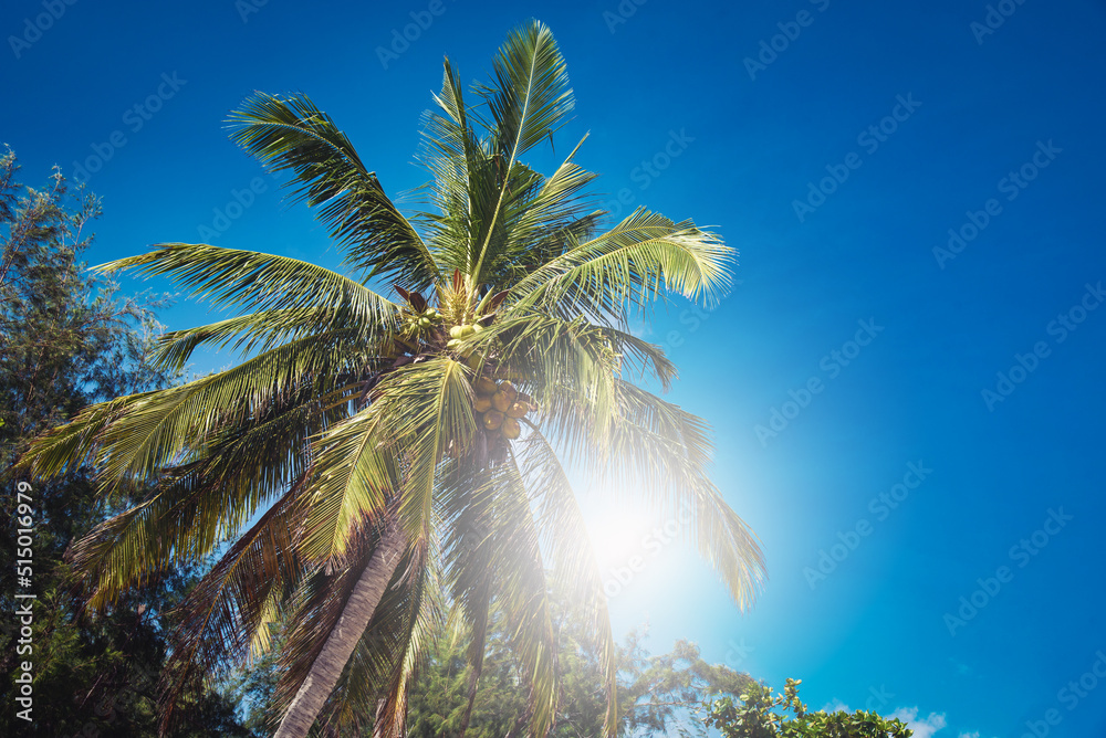 Coconut palm trees on beach and blue sky with cloud background. Vintage tone