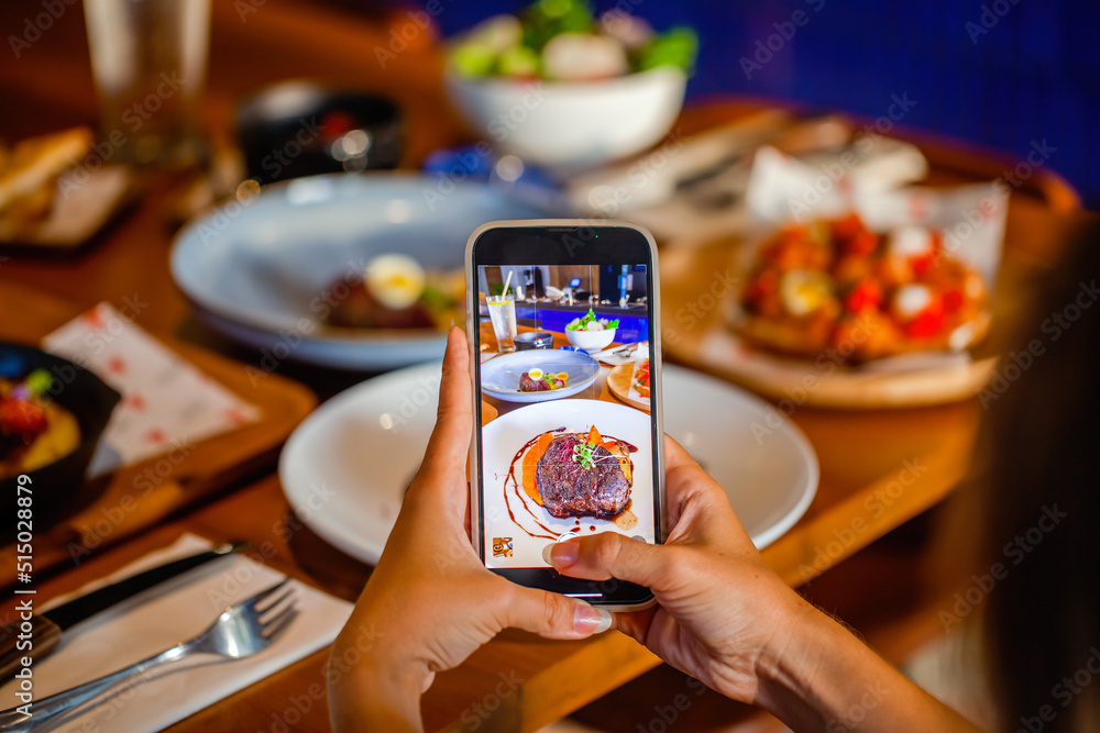 Woman makes mobile phone photo of baked beef meat in luxury restaurant. Smartphone food photography of fine food dinner. Woman hands taking phone photo of food in trendy style for social media