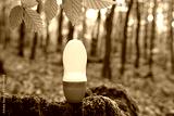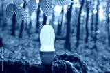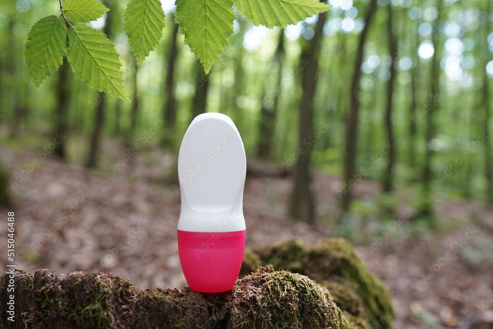 Roll-on deodorant antiperspirant staying on the wood in the forest, beautiful natural background with green foliage, concept natural cosmetics, natural product