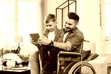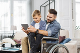Disabled dad sitting in wheelchair and holding son on knees while playing on modern tablet in bright living room. Friendly caucasian family gaming together at home.