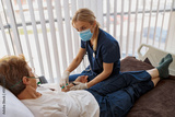 Doctor putting drip in the arm of patient in mask during pandemic of Covid 19. High quality photo