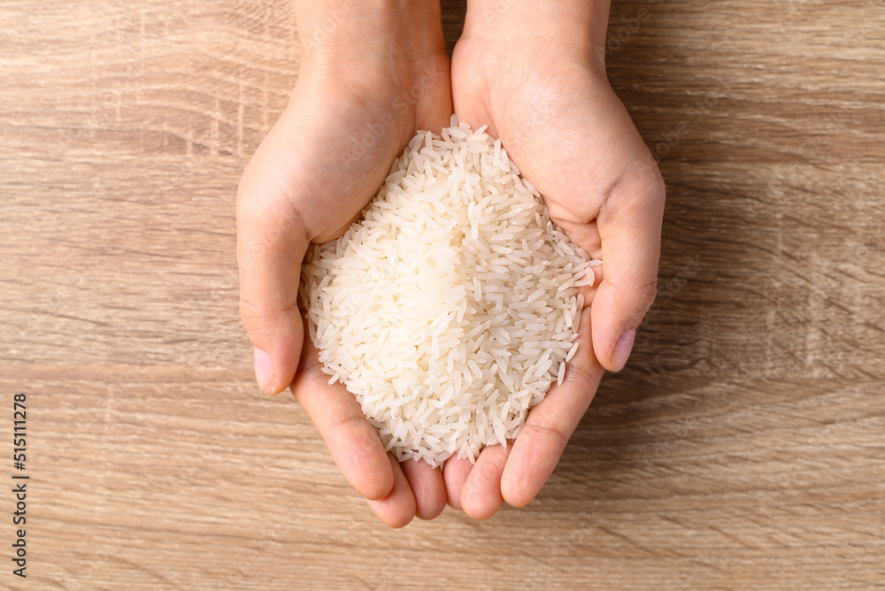 Thai jasmine rice seed in hand on wooden background, Organic rice grain, Table top view