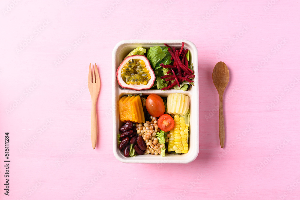 Fresh vegetables salad in biodegradable bowl on pink background, Healthy vegan food
