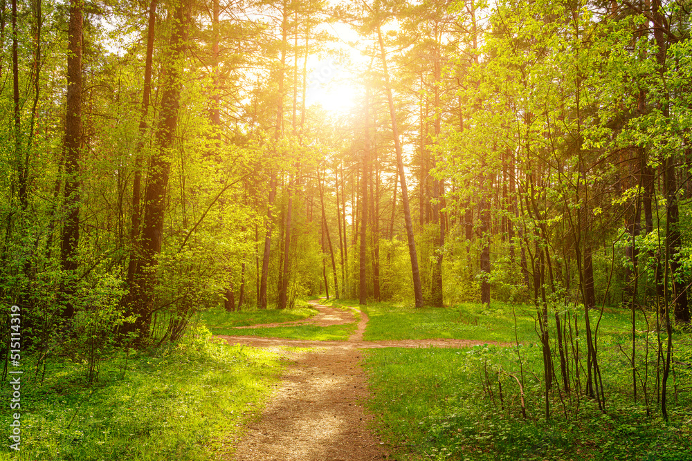 Sunset or dawn in a pine forest in spring or early summer. The sun among the trunks of pines.