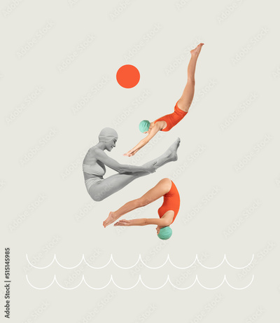 Contemporary art collage. Girls in retro style swimming suit and cap diving, swimming