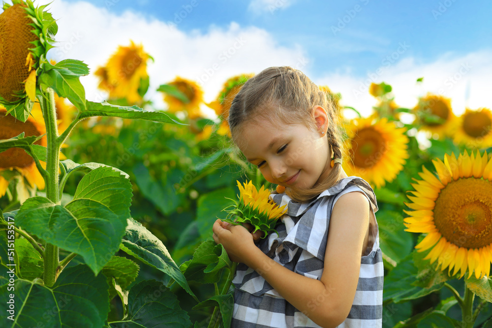Beautiful little girl enjoying nature . Happy smiling female kid standing in sunflowers field.