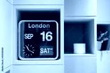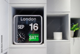 white flip clock on white shelf, retro analog timer. show time on 16 september at late morning, london.