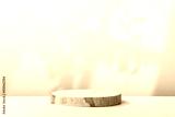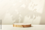 Wood slice podium with leaves and window shadows on beige background for cosmetic product mockup
