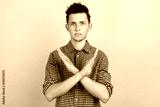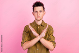 Man over isolated pastel background making stop gesture cross arms x with his hands