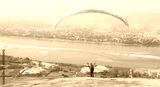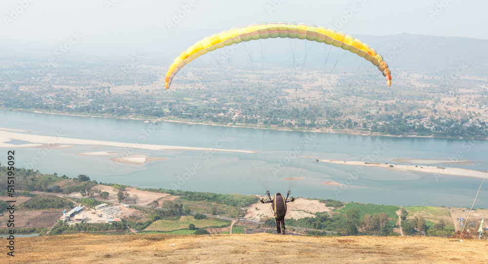 Paragliding in the sky. Paraglider flying over Landscape from Beautiful View Mekong River at Wat Pha Tak Suea in Nongkhai, Thailand.Aerial view. Concept of extreme sport, taking adventure/ challenge.