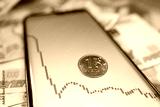 Economic crisis, decline of world economy. Ruble devaluation. The fall of Russian currency. Currency exchange. graph of sharp drop of ruble exchange rate on the screen of a smartphone and one ruble