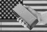 gold bar in a man's hand on the background of the American flag. America's gold. Trading on the stock exchange is a money saving concept.