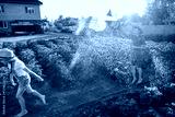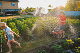 Sibling children frolic splashing with a water hose in the backyard in the garden on summer holidays in the village on a hot day