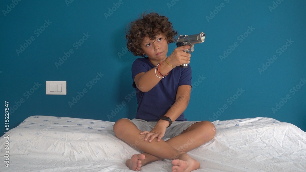 8-year-old boy alone at home finds a real gun in his parents' drawer - in America more and more children find guns in domestic places - social danger and violence