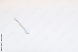 Closeup of a white cotton bud, also called cotton swab, on white background. Reading promo text on copy space.