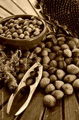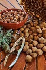 Heap of almonds in shell scattered on a wooden table and a clay bowl with hazelnuts after the october harvest and a nutcracker. Autumn's seasonal food concept background. Ingredients for pastry.