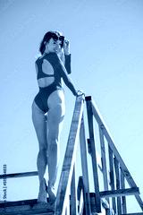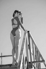 Stylish female on wooden structure on beach