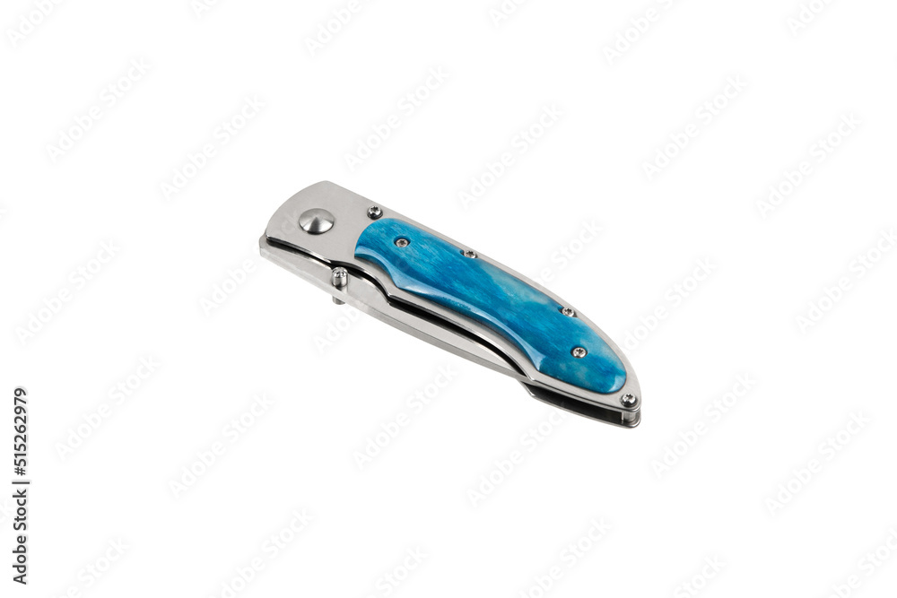 Pocket folding knife isolate on white back. Compact metal sharp knife with a folding blade.