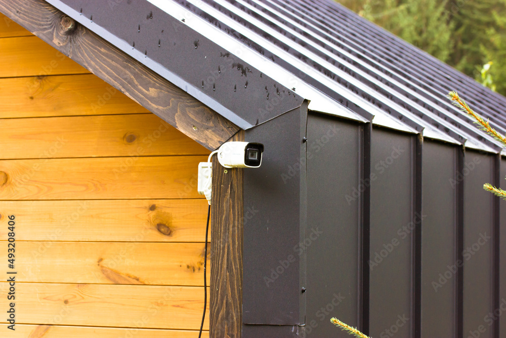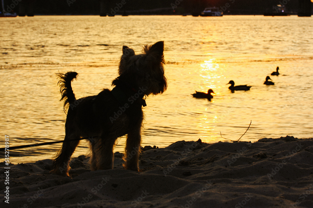 A cute funny little Yorkshire Terrier puppy standing on river bank, lake, sea, ocean shore, looking with interest at the wild ducks swimming on a water. A silhouette of a doggie, dog, lapdog on a walk