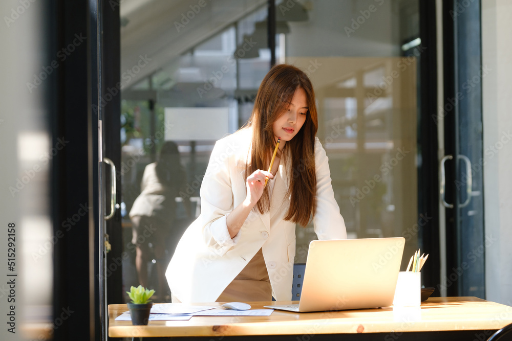 Businesswoman is working at office and using laptop.