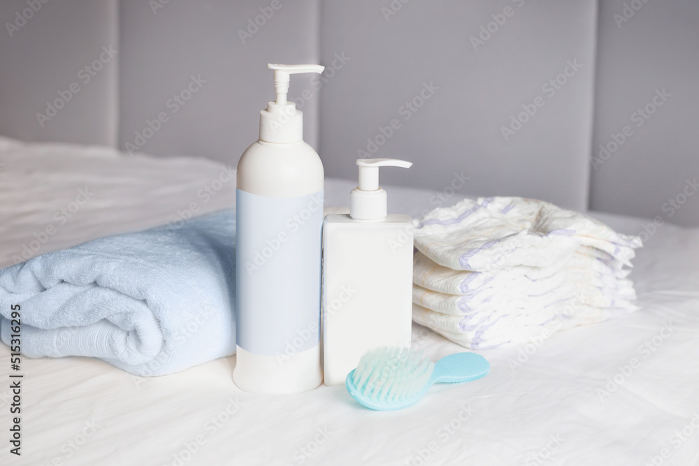 body cream, comb, bath towel, disposable diaper and diapers on a bed. Baby care. First days of life. Feeding and motherhood