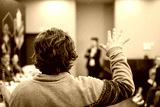 Anonymous man gesturing during presentation in conference hall