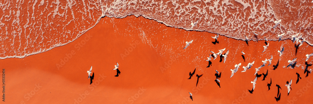 Seascape with flying seagulls and sandy beach. Top view. Horizontal banner