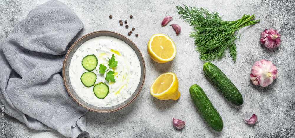 Tzatziki sauce in a bowl with ingredients. Gray rustic background. Traditional Greek sauce made from yogurt and vegetables. Top view, flat lay. Banner